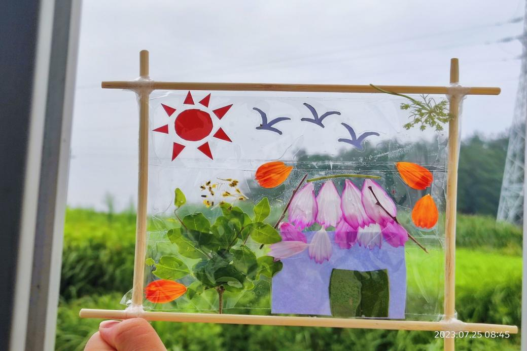 正式开始学习如何用树叶、花朵粘贴作画前,每个班级由助教老师引导学生们到指定区域拾叶捡花。助教老师们和孩子们就地取材,一起捡拾自然掉落的树叶、花瓣、树枝等。在这个过程中,支教团成员和孩子们一起走近、观察、探索、体验大自然,切身感受大自然多彩的魅力以及万物蓬勃的生命力。同时,支教团成员也希望能够通过拾叶捡花这个过程培养孩子们热爱自然、尊重自然、保护自然的意识。材料准备完毕后,由主讲老师为孩子们讲解树叶画的制作过程,如何粘贴、如何固定等。孩子们观察自己拾回来的树叶、花朵,对它们进行色彩、形状的搭配。有的孩子用深浅不一的绿叶作草地,有的则用蓝色的花瓣作天空;有的用形状不同的树叶花瓣拼出了她眼中的“美丽四季”。课程最后,孩子们将自己制作好的树叶画放置在窗边进行展示,并一一为老师和同学们介绍了创作思路、作品含义等。其中一个孩子表示:“每一朵花都代表一个太阳,老师们就像这些太阳一样,给我们带来了阳光和温暖!”