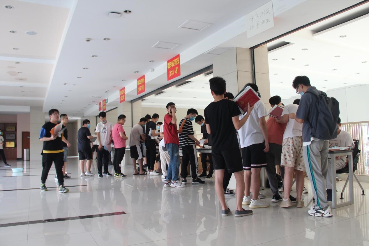 上午八点半,学院2020届毕业生陆续抵达办公地点,开始办理相关事宜。办公流程主要是领取体质证书、毕业证和学位证、党团组织关系转接并注销学生证。毕业生辅导员曹鹏负责统筹工作,并及时解答毕业生们的问题。在现场志愿者的引导、分流下,毕业生们排队等待依次进行,现场井然有序。