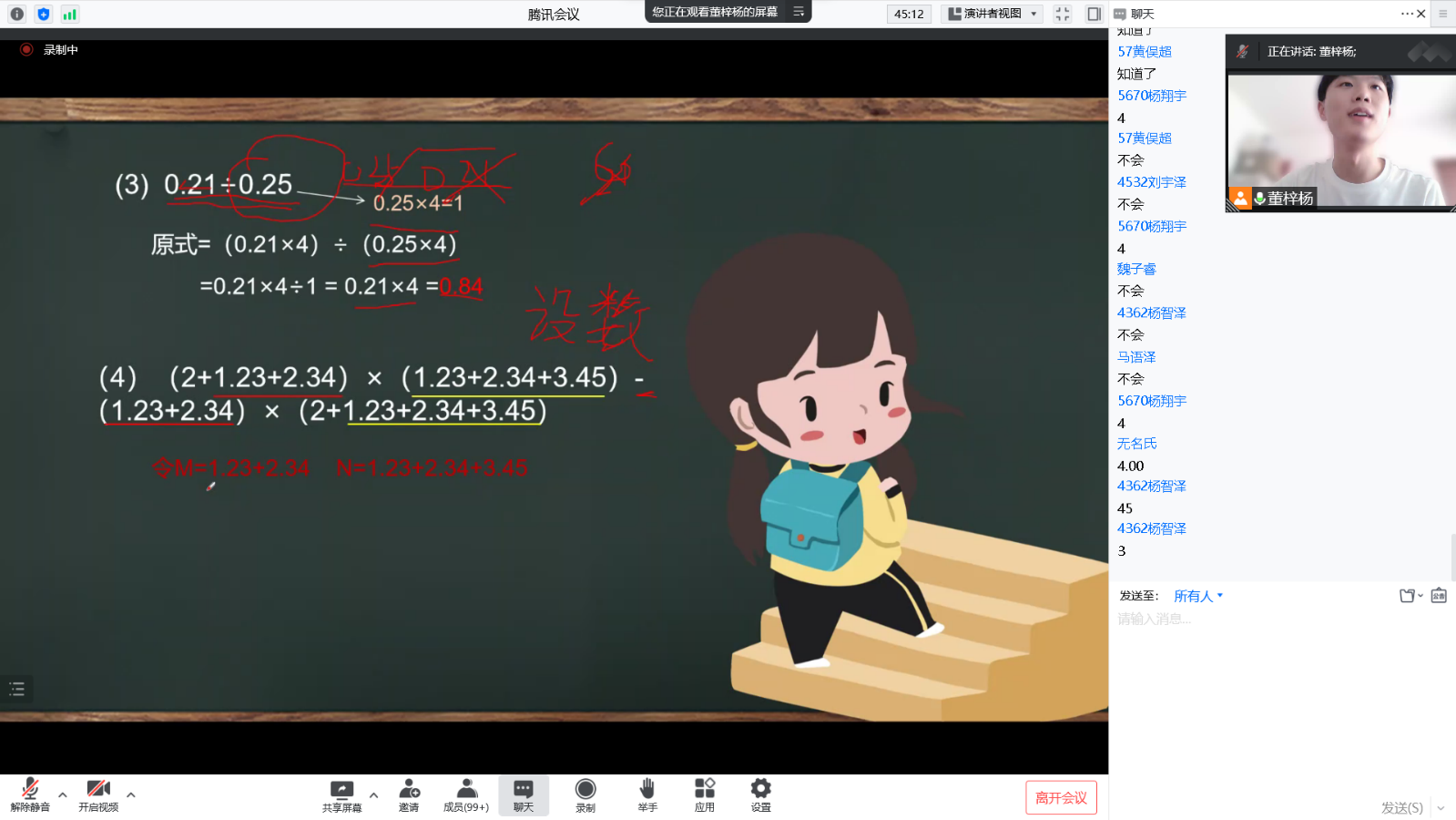 上午,李晓峰同学通过知识与故事相融合的方式为同学们带来了一堂生动有趣的法治课堂。李晓峰同学首先通过几个案例引发了孩子们对相关法治知识的思考,并以此切入主题,引出课堂内容:要强化法律意识,提升法治思维,一方面规范好自身行为;另一方面在遇到不法侵害时要勇于发声,拿起法律的武器保护自己,维护自身权益。课上,同学们参与度高,氛围积极活跃。下午的课程则是由董梓杨同学作为主讲老师给同学们上的一堂精彩纷呈的奥数课程。课程伊始,董梓杨同学通过一个与数学有关的趣味故事开启本次授课,有效地带动了课堂氛围和同学们的上课热情。随后,董梓杨同学通过知识点与例题相结合的方式,帮助同学们更好地理解和领会课程内容。在交流互动的过程中,同学们积极回应,踊跃表达自己的想法,并由董梓杨同学帮助解答。