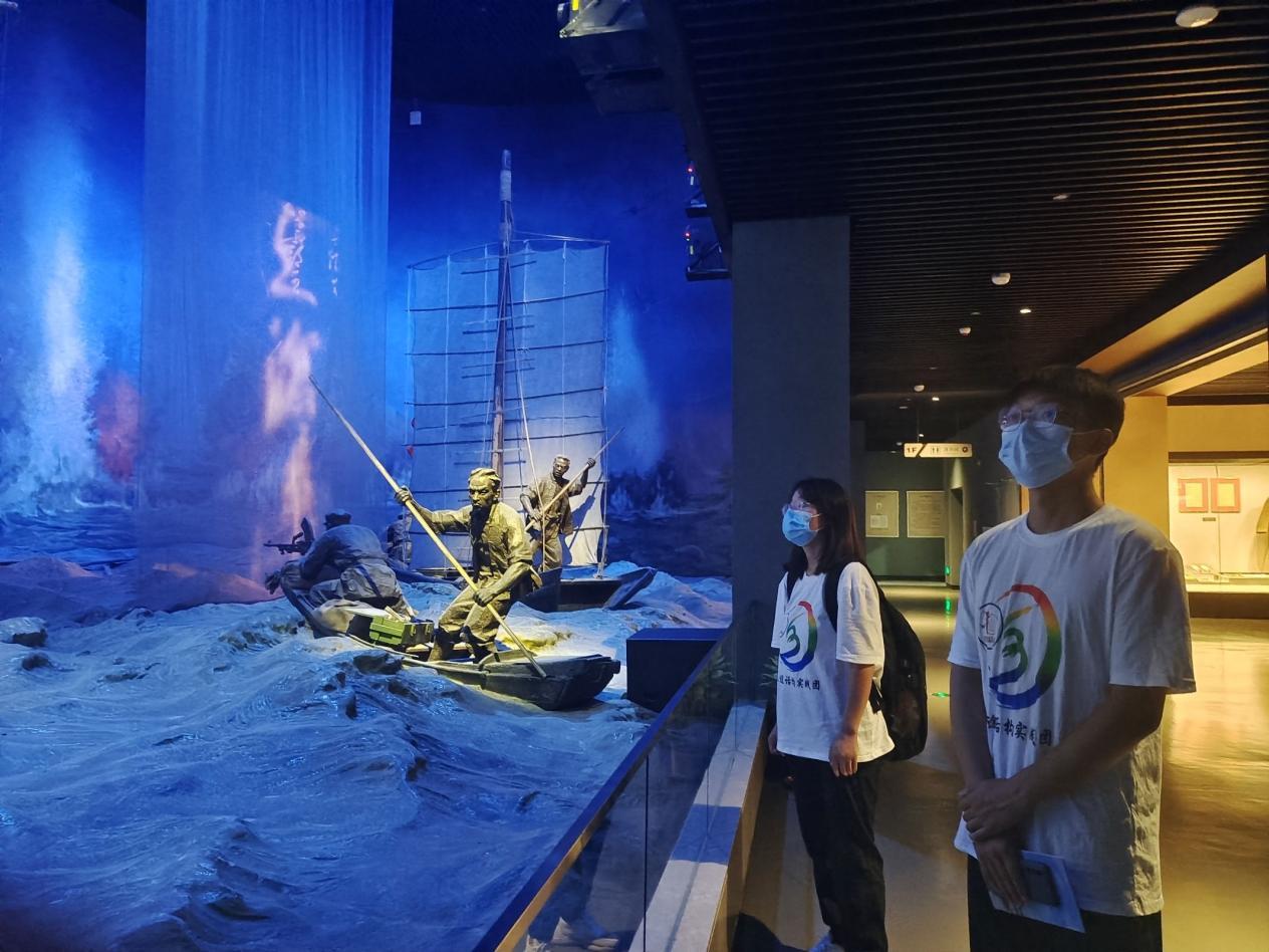 一份份历史资料记载着那段战场硝烟,一件件珍贵文物述说着往昔岁月。不时停留的步伐,凝神专注的眼神,实践团成员走走停停,不时相互低声交流着各自的见解。或是蒙着历史光辉的徽章,或是泛着陈黄的纸页,或是接运解放军过江的“京电”号小火轮,或是解放军渡江使用过的各类轻重机枪,或是江北人民送粮草、抢救伤员使用的木制三轮手推车,或是原中华民国“总统府”秘书长办公室的门牌及美制餐具……文物大量陈列于眼前,记载着中国革命史的发展历程,展现了中国共产党和中国人民为寻求真理进行艰苦卓绝斗争的伟大业绩。在步步行进的过程中,实践团成员们切身感受到渡江战役的艰险和革命先辈们勇渡长江的英雄气魄,深刻感悟到了中国共产党领导中国人民浴血奋战,经过无数仁人志士前仆后继、流血牺牲,最终取得革命胜利的不易。